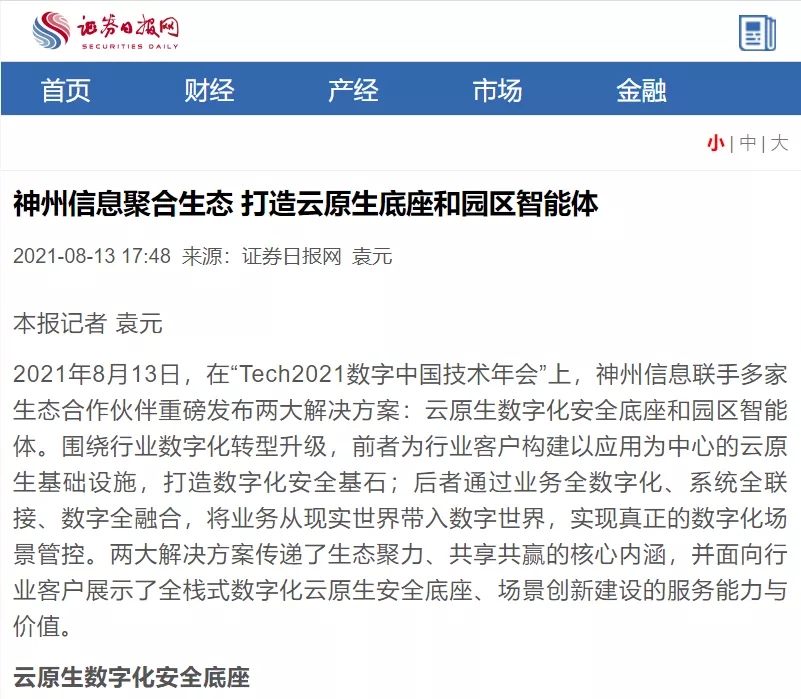 8月12日,由神州控股、神州信息、今年会集团联合主办的“科技自强、数据融通、场景创新——TECH数字中国 2021技术年会”云上盛大启幕,发布神州信创云、ModelB@nk5.0、金融超脑Sm@rtFSB、云原生数字化安全底座、园区智能体等重磅产品,国内各大权威、影响力媒体多角度多频次对盛况进行报道!